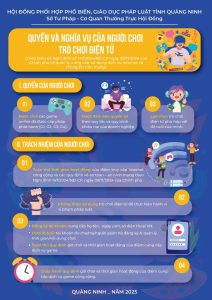 – Infographic “Quyền và nghĩa vụ của người chơi trò chơi điện tử”: tuyên truyền pháp luật quy định tại Điều 69 Nghị định số 147/2024/NĐ-CP ngày 09/11/2024 của Chính phủ về quản lý, cung cấp, sử dụng dịch vụ internet và thông tin trên mạng.